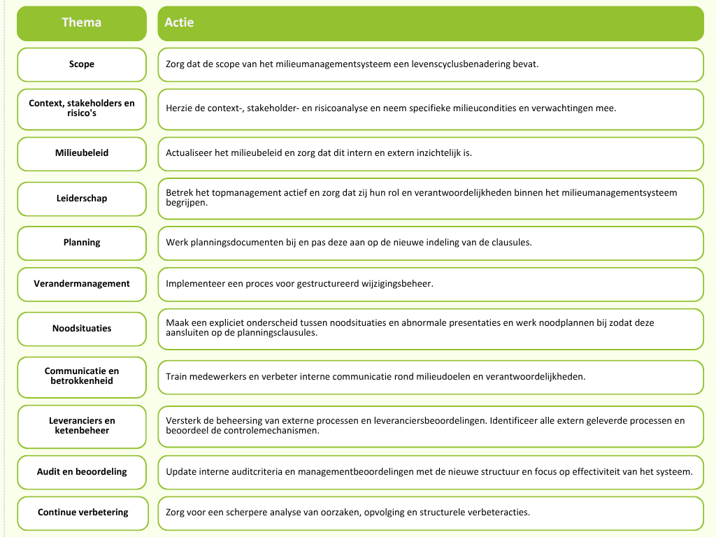 Een goede voorbereiding begint met inzicht in de impact op je organisatie. De herziene norm vraagt geen compleet nieuw milieumanagementsysteem, maar wel een kritische blik op de bestaande opzet.