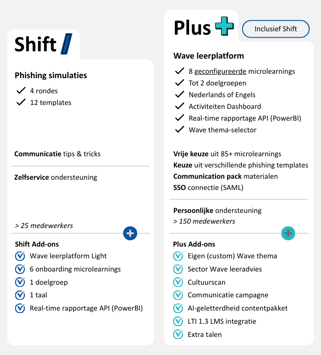 Ja. Binnen het Plus-programma is het mogelijk om microlearnings aan te passen op sectorspecifieke dreigingen en wettelijke vereisten, zoals AVG, ISO 27001, NIS-2, NEN 7510, DORA, kennisveiligheid, de AI-Act en de Toegankelijkheidswet.